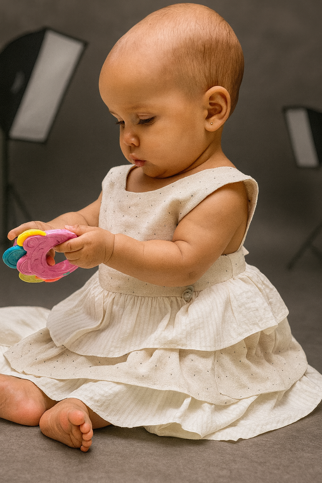 Conjunto de Tres piezas , viene acompañado de un torero sin mangas con un diseño de volantes en capas con delicado bordado, un short tipo leggins de algodón elástico, ideal para brindar libertad de movimiento y un moño para completar el look.
