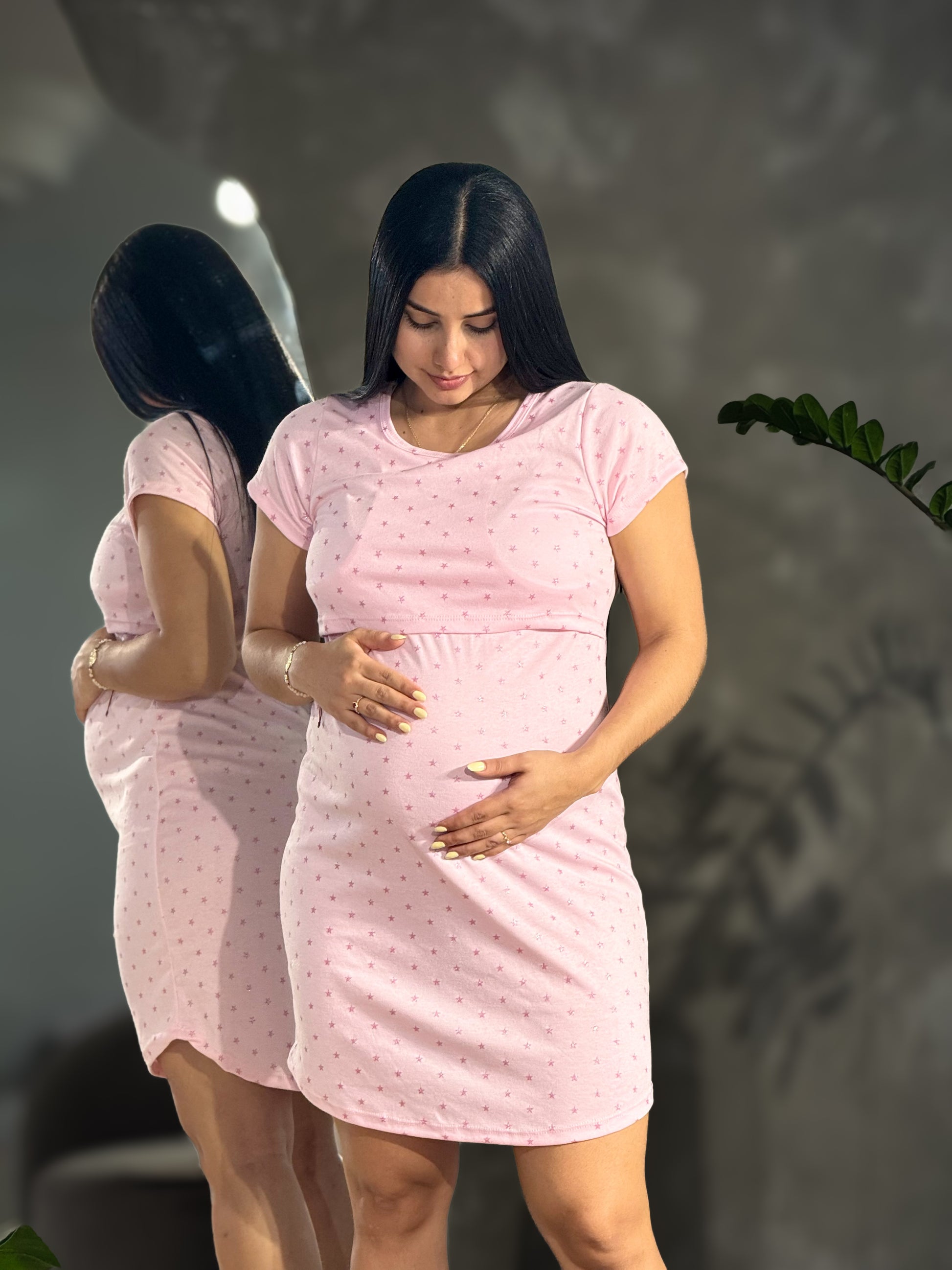 Pijama maternal en algodón 100% Patprimo, una tela fresca, suave y cómoda. Su diseño con manga corta y apertura tipo camisera facilita la lactancia de manera práctica y discreta.