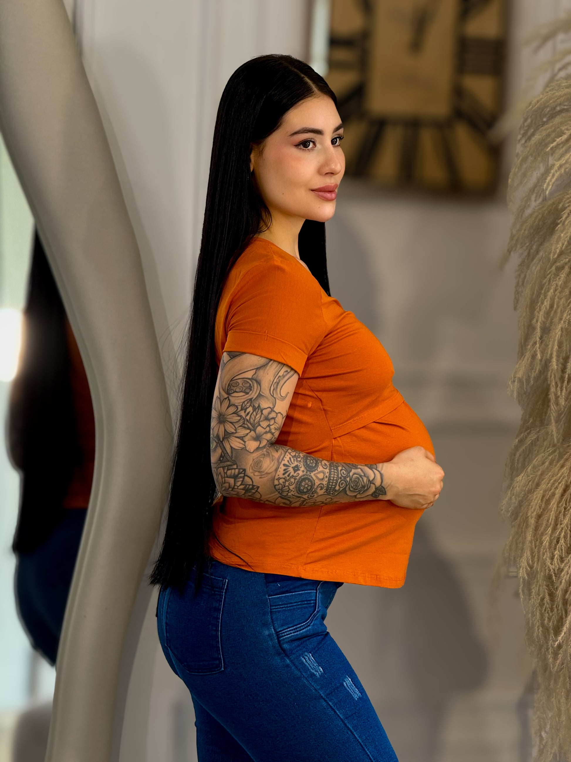 Diseñada para acompañarte durante el embarazo y la etapa de lactancia, esta blusa en tela Viscosa ofrece una textura suave, elástica y cómoda que se ajusta perfectamente a tu cuerpo sin perder la forma. Ideal para el día a día, sin renunciar al estilo ni la comodidad.