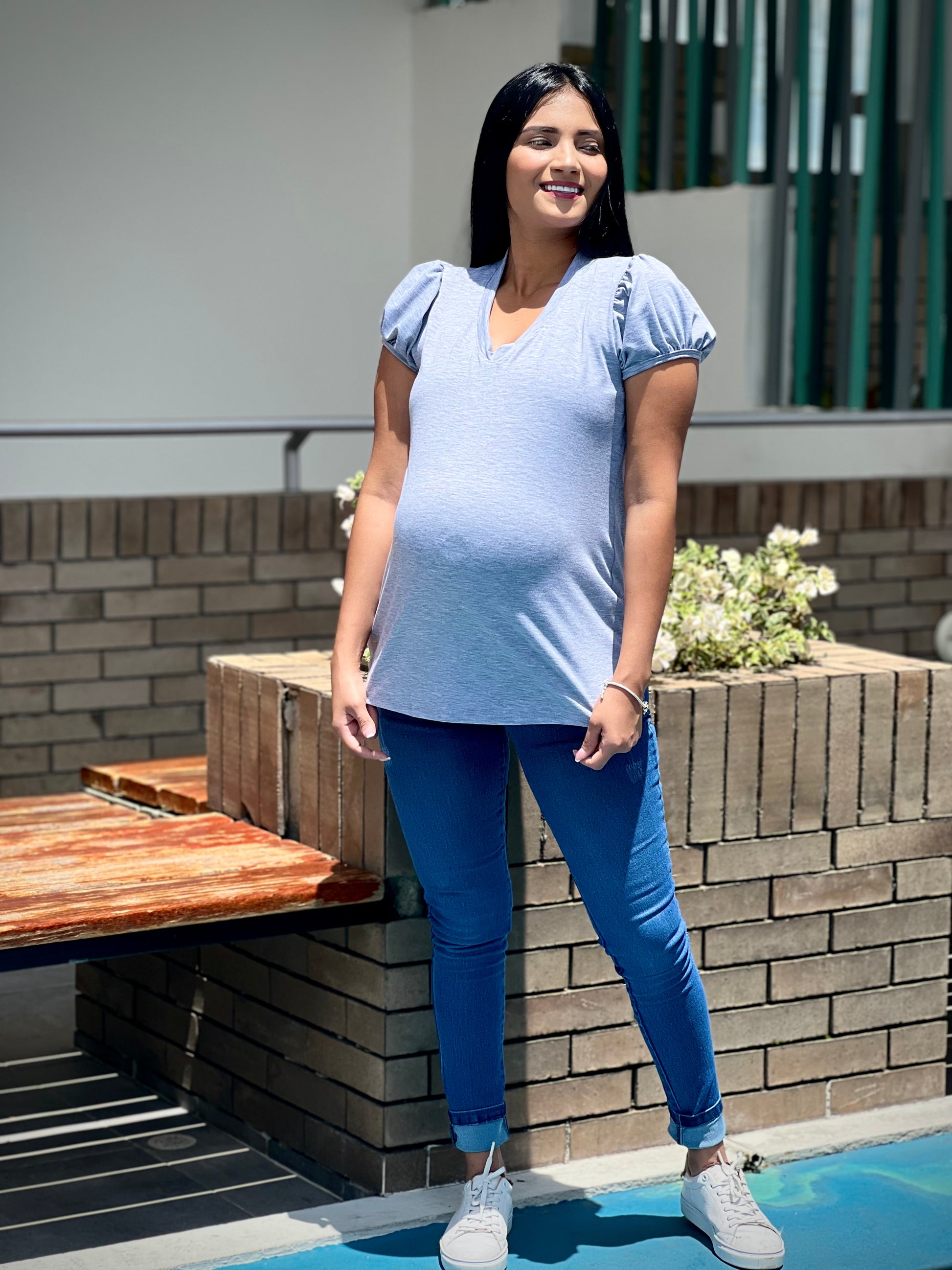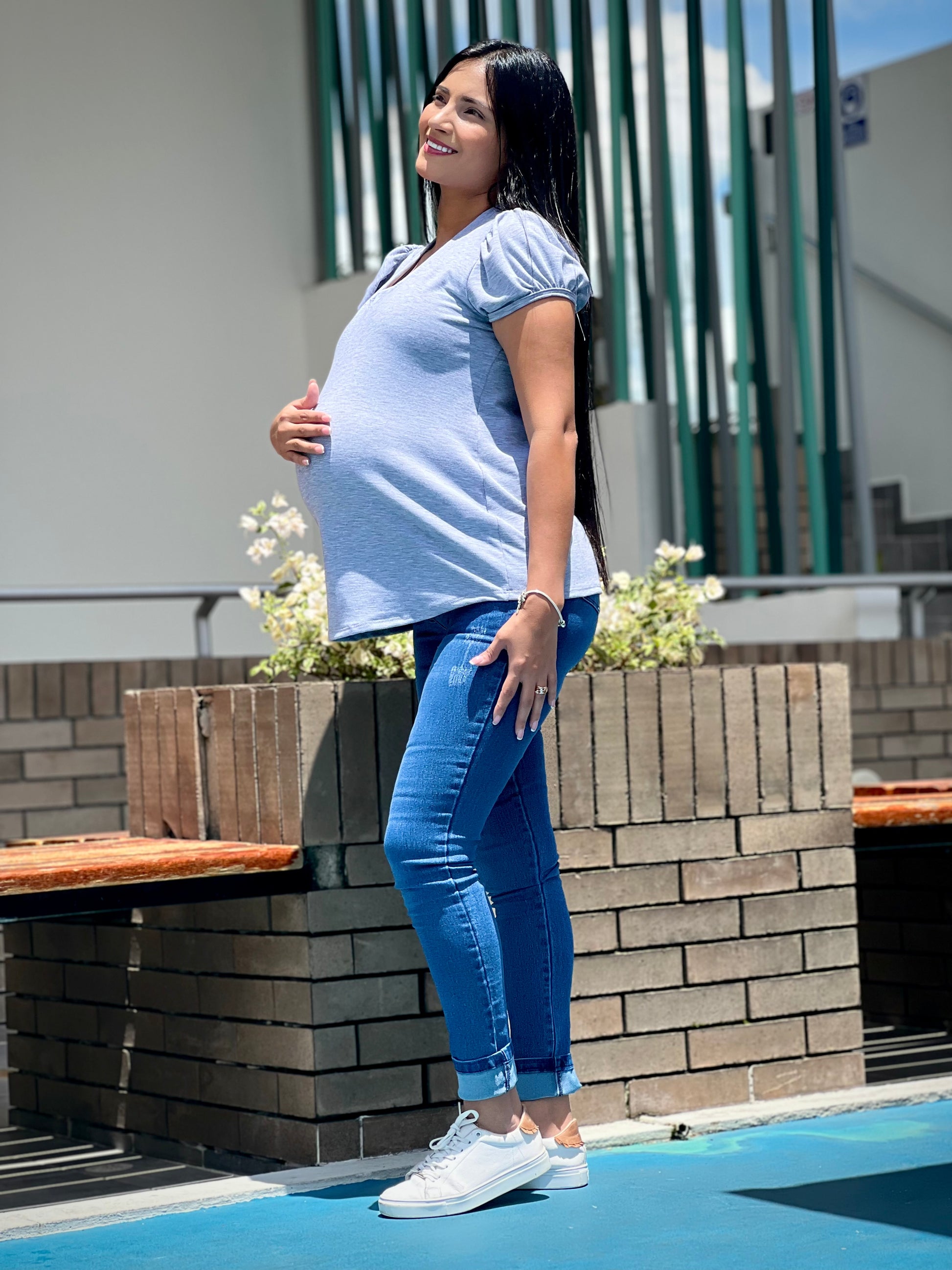Camiseta estilo sport con manga bombacha la cual te dará elegancia, fabricadas en telas peruanas licradas ,suaves para tu comodidad hasta los 9 meses de embarazo.