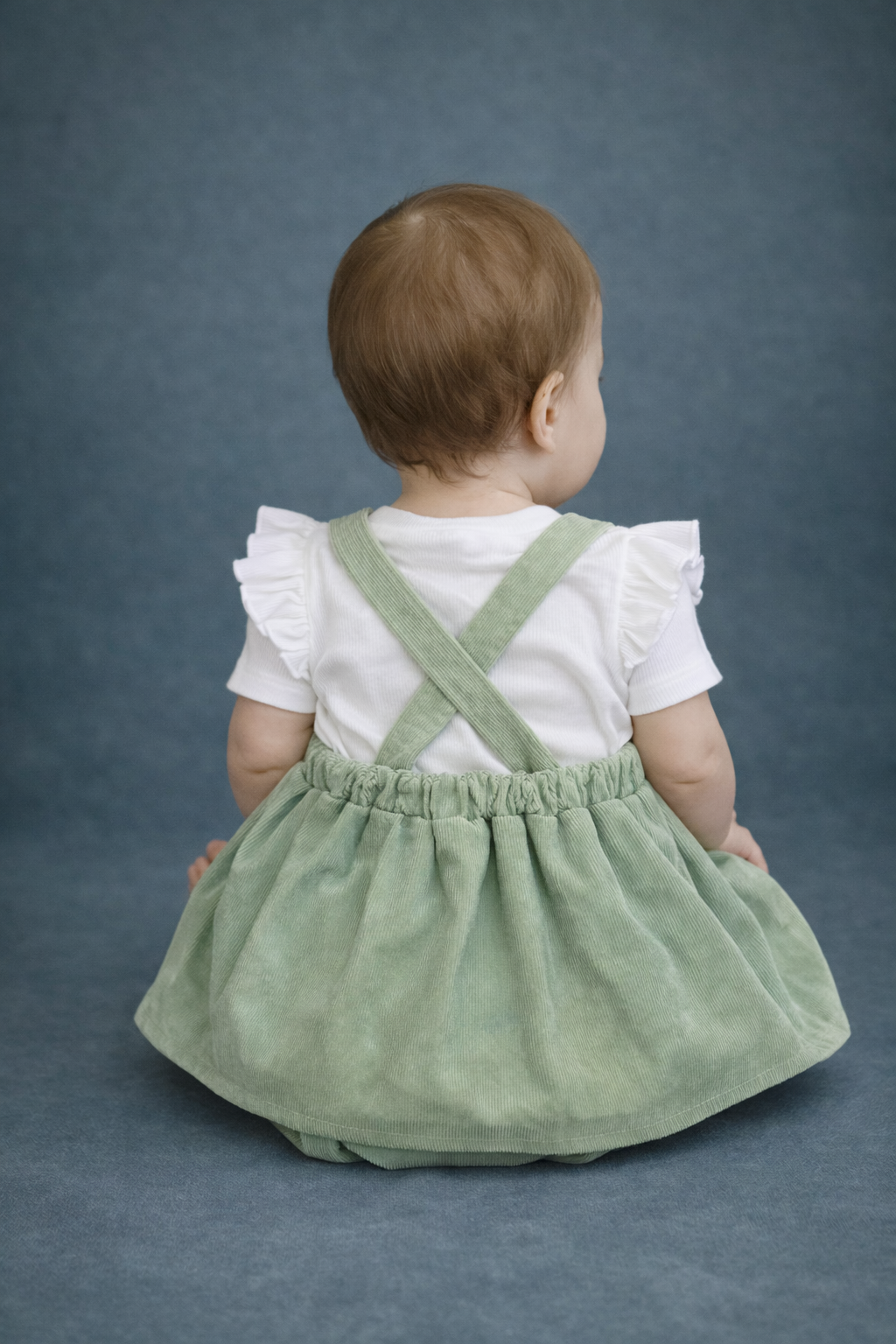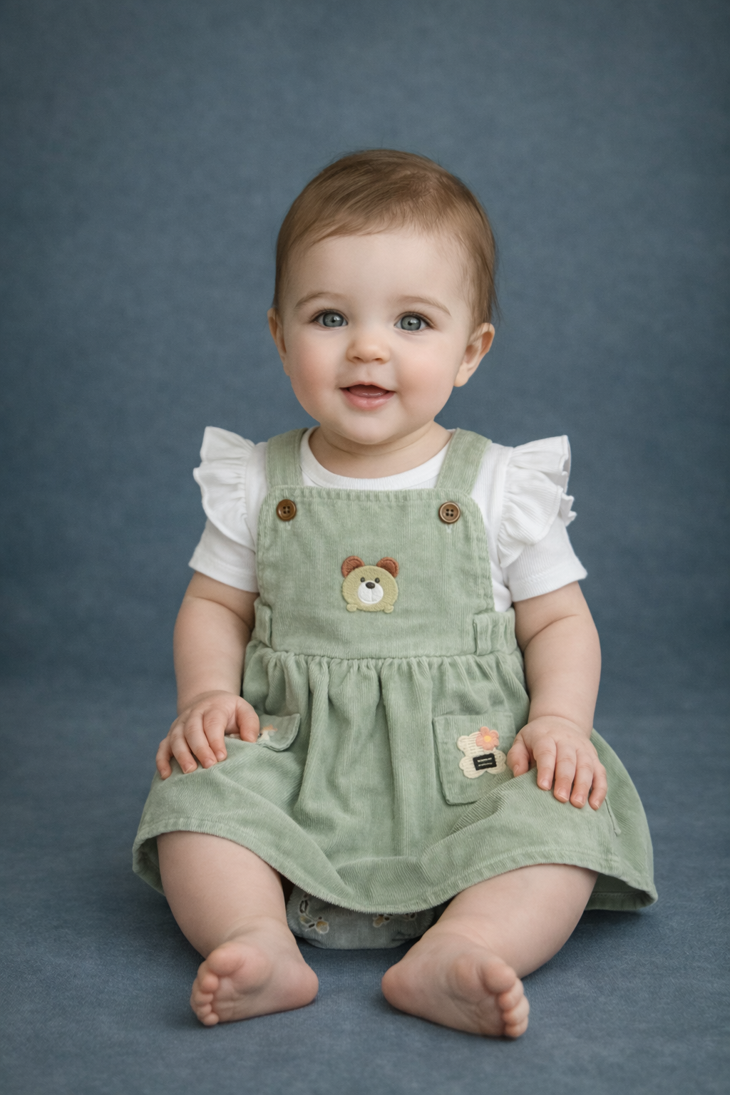 ¡Un look delicado y súper tierno para tu peque! 😍✨ Este conjunto de 2 piezas combina una blusita blanca con mangas con volantes 🤍🎀 y una jardinerita tipo vestido en tono verde suave 🌿, con detalles adorables al frente que lo hacen perfecto para cualquier ocasión 👶💕