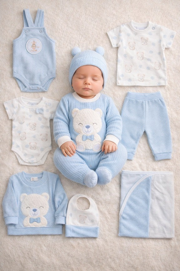 ¡El combo perfecto para los primeros días de tu bebé! 🍼✨ Este set de 9 piezas incluye todo lo esencial en tonos suaves y diseño súper tierno, ideal para mantener a tu recién nacido abrigadito, cómodo y siempre listo para cualquier momento 💙👶. Perfecto para salida de clínica, uso diario o como regalo 🎁