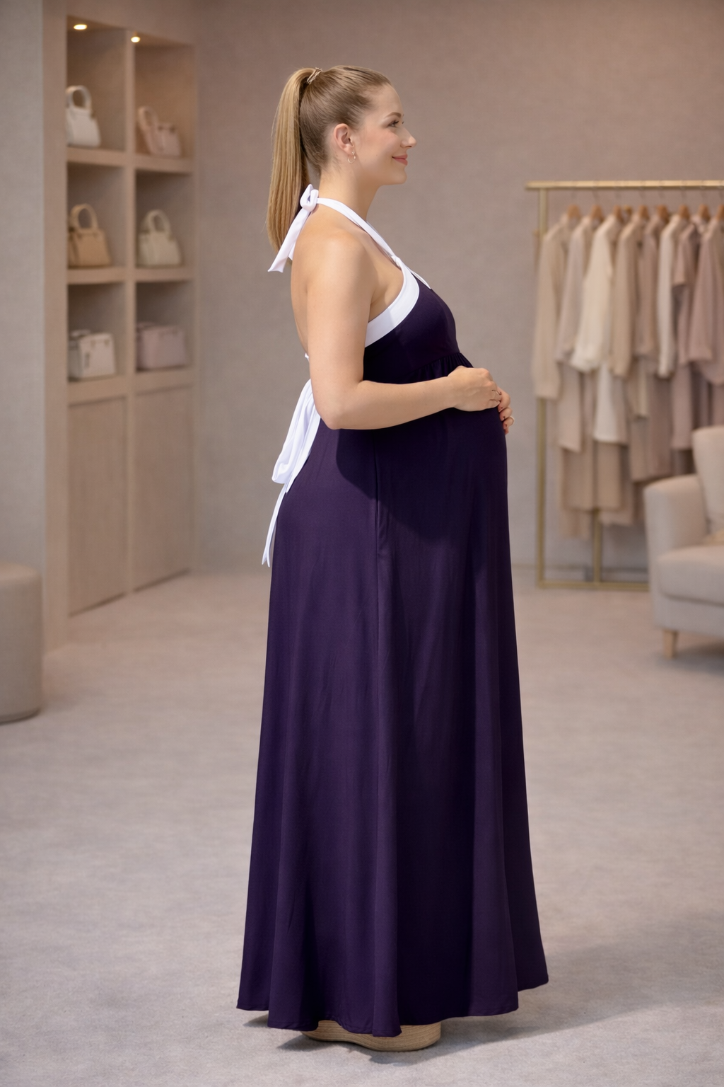Vestido de maternidad Pampa largo y fluido en tono azul oscuro, con escote halter cruzado en contraste blanco y caída elegante que realza tu pancita. Sofisticado, cómodo y femenino, ideal para eventos, celebraciones o momentos especiales.