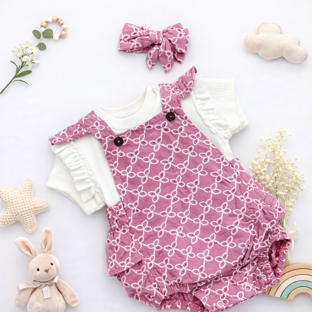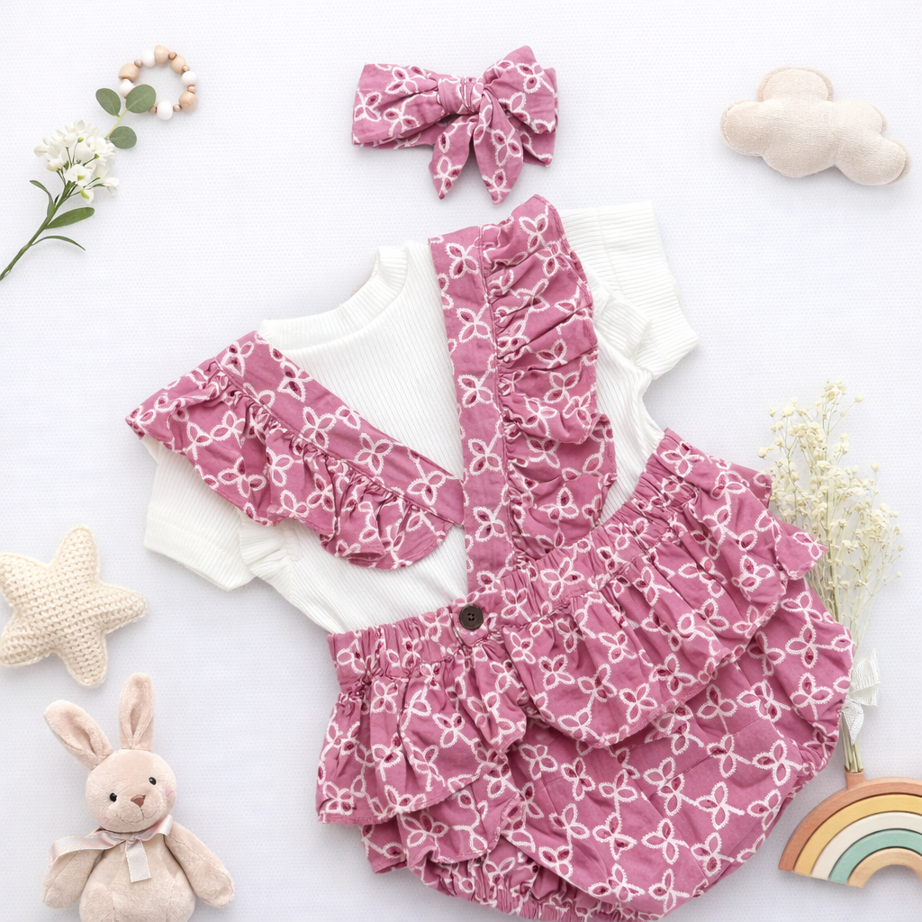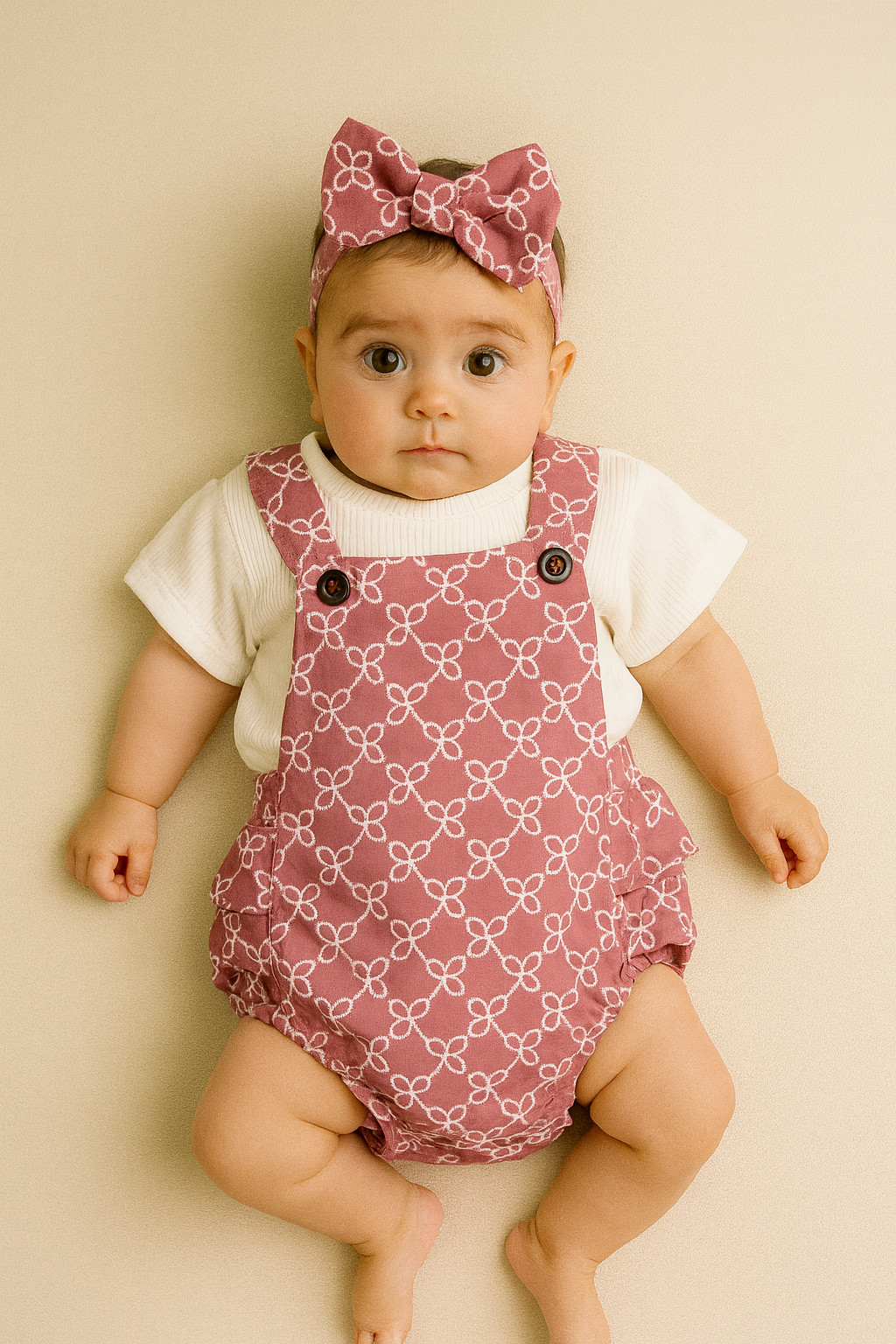 Este encantador Asoleador de dos piezas es perfecto para las salidas de las más pequeñas. Incluye una blusa fresca con un delicado estampado de flores y un moñito a juego que realzan su ternura y estilo.